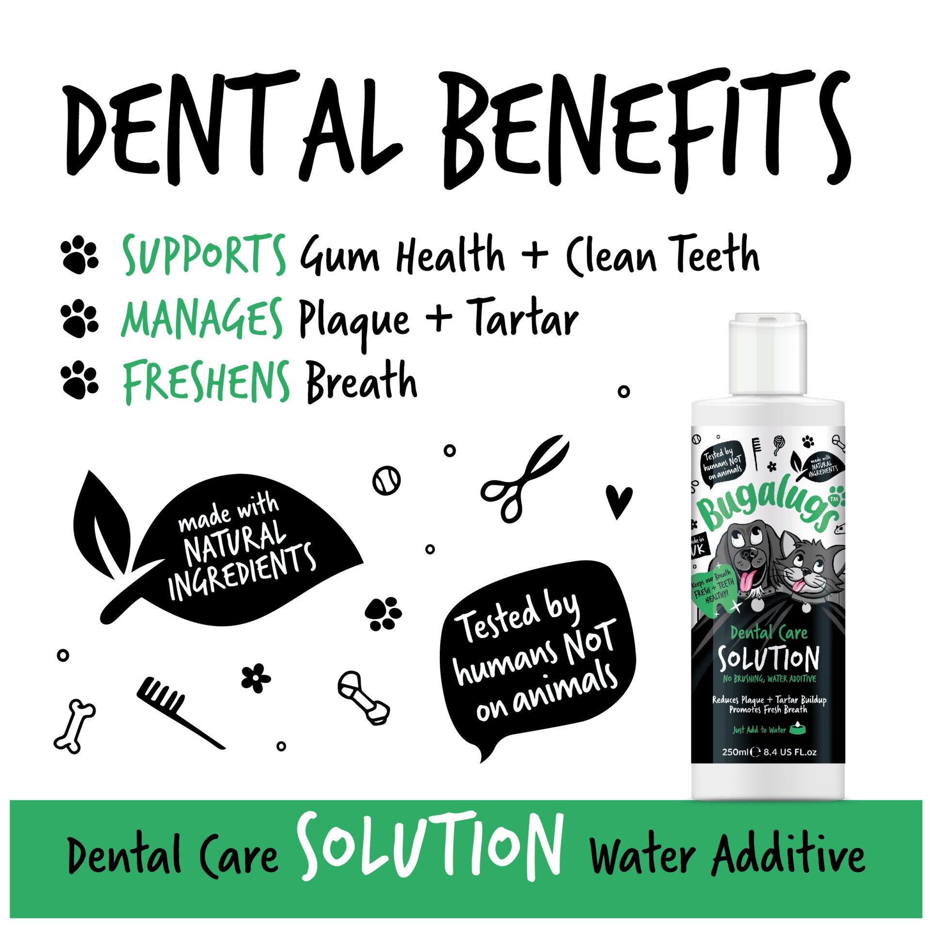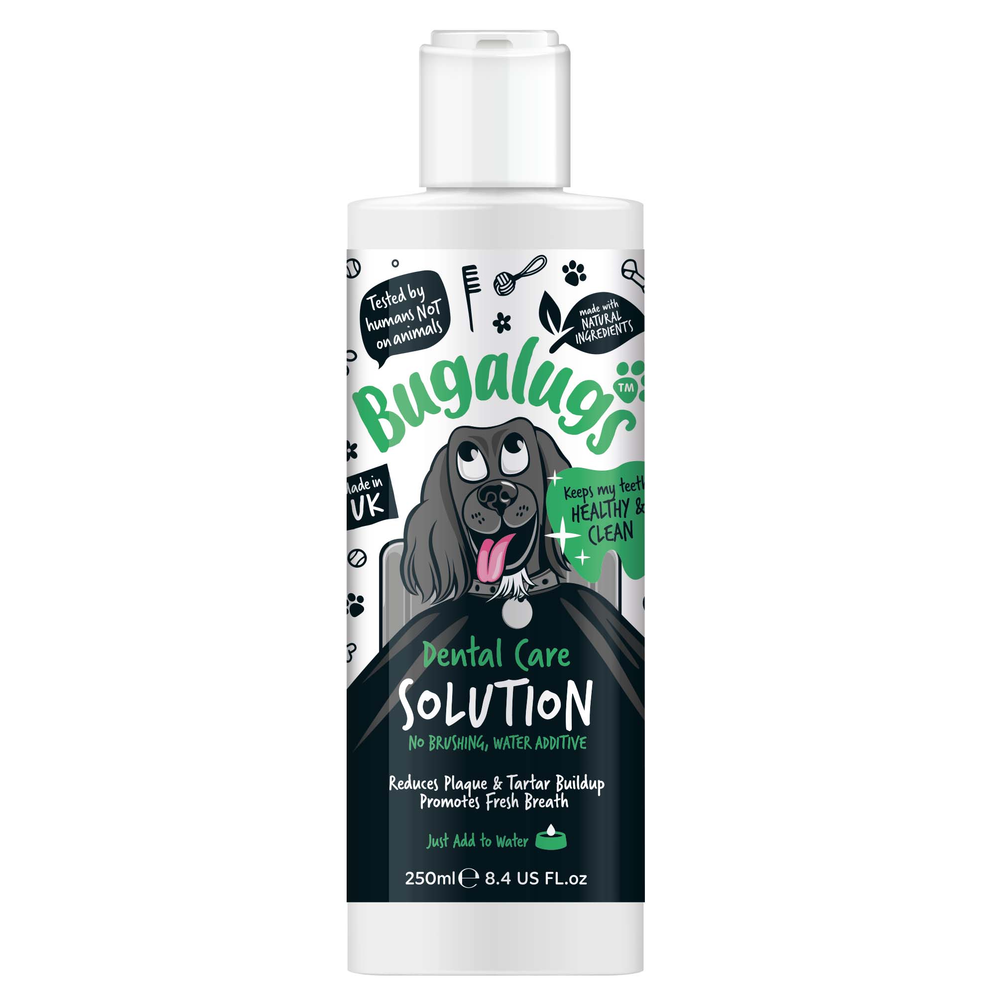 Bugalugs Dental Care Solution is an effective and convenient dog dental care product that is added directly to drinking water. This helps reduce the amount of bacteria in your mouth that cause plaque and bad breath.