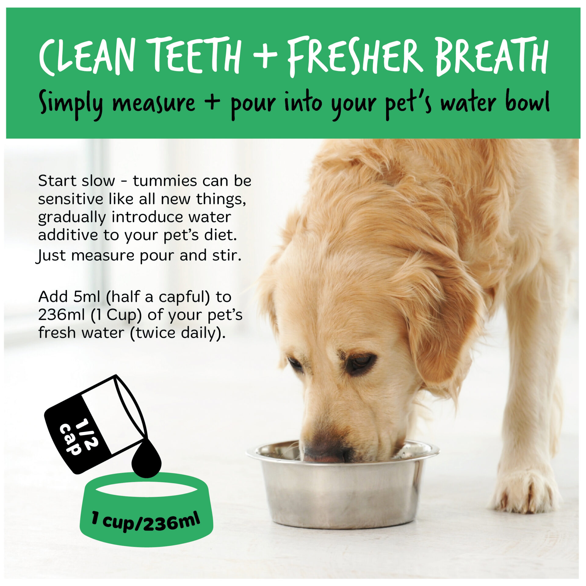 This water additive for dogs is suitable for use in dogs of all ages and is easy to incorporate into your daily routine. Regular use helps to keep the oral cavity clean and the breath fresh.