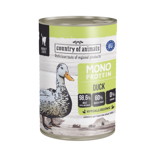 Country of Animals – Monoproteiinne pardilihakonserv kassidele on loodud pakkuma kassile võimalikult looduslähedast toitumist. Ühes konservidosas on vaid üks loomne valk – kvaliteetne pardiliha –, mis aitab selgelt jälgida, kuidas kass erinevatele proteiiniallikatele reageerib. See teeb toidu eriti väärtuslikuks kassidele, kellel esineb toidutundlikkust, sügelust või seedimisega seotud probleeme.