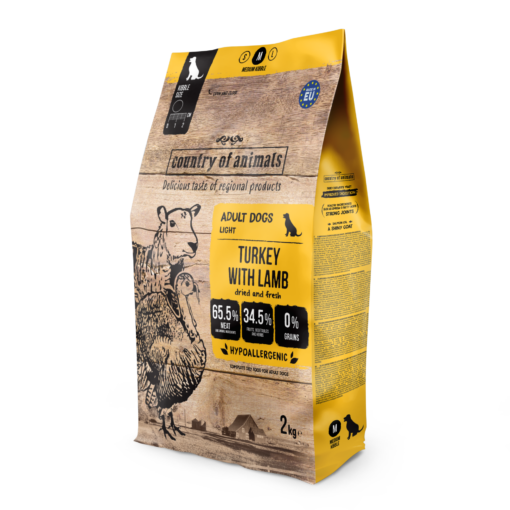 Country of Animals Kalkuni ja Lambalihaga (Turkey with Lamb) on täisväärtuslik kuivtoit täiskasvanud koertele, mis ühendab kergesti seeditava kalkuni ja toitainerikka lambaliha. See maitsev ja tasakaalustatud retsept sobib ideaalselt koertele, kes vajavad kvaliteetset ja õrna valguallikat igapäevaseks toitumiseks.