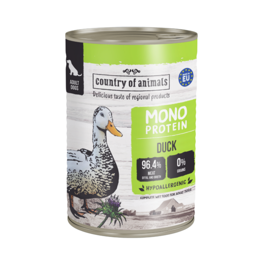 Country of Animals Duck Monoprotein on luksuslik ja toitaineterikas märgtoit täiskasvanud koertele. Iga purk sisaldab vaid üht lihaallikat – pardiliha, mis on esimene koostisosana, tagades maksimaalse maitse ja toitainete koguse.